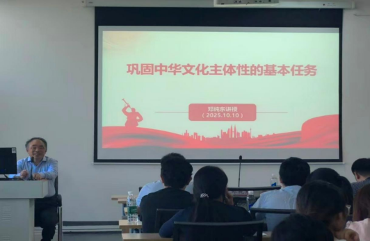 2025年10月10日上午,十三届全国政协委员国政协社会和法制委员会委员、中国政策科学研究会副会长、国社会科学院马克思主义研究院原院长、党委书记邓纯东教授受邀莅临太阳成集团tyc33455cc雨母校区崇德楼418报告厅,为师生带来了一场题为“现固中华文化主体性的基本任务”的学术讲座。本次会议由太阳成集团tyc33455院长代艳丽教授主持,学院师生代表积极参与。
