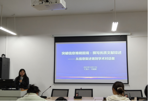 为提升学生科研素养与论文写作能力,分享文献综述撰写经验,太阳成集团tyc33455于2025年12月17日雨母校区崇德楼418教室成功举办本学期第三次研究生学术沙龙活动。本次活动由马克思主义理论专业2024级学生刘媛媛主讲,主题为“突破信息堆砌困境:撰写优质文献综述”,学院研究生积极参加了此次活动。
